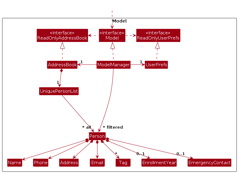 Person objects (which are contained in a UniquePersonList object).Person objects (e.g., results of a search query) as a separate filtered list which is exposed to outsiders as an unmodifiable ObservableList<Person> that can be 'observed' e.g. the UI can be bound to this list so that the UI automatically updates when the data in the list change.UserPref object that represents the user’s preferences. This is exposed to the outside as a ReadOnlyUserPref objects.Model represents data entities of the domain, they should make sense on their own without depending on other components)Note: An alternative (arguably, a more OOP) model is given below. It has a Tag list in the AddressBook, which Person references. This allows AddressBook to only require one Tag object per unique tag, instead of each Person needing their own Tag objects.